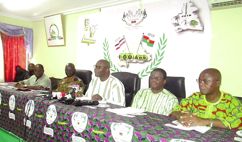 A quelques jours de la célébration du 59e anniversaire de l’accession du Burkina Faso à l’indépendance, le ministre d’Etat, ministre de l’Administration territoriale, de la Décentralisation et de la Cohésion sociale (MATDC), Siméon Sawadogo, par ailleurs président du Comité national d’organisation (CNO) du 11-Décembre, était face à la presse, le lundi 2 décembre 2019 à Tenkodogo. Il s’est agi pour lui de faire le point sur l’état des préparatifs des festivités et les réalisations faites au profit de la région du Centre-Est qui accueille l’événement qui coïncide avec les 100 ans de la création de la Haute-Volta. Le président du CNO a indiqué que la commémoration du 11-Décembre se déroule dans un contexte sécuritaire « très difficile » marquée par des attaques terroristes à répétition. « Le coût total de ces infrastructures à réaliser par l’Etat et l’ensemble de ses démembrements dans le cadre des festivités du 11-Décembre dans la région du Centre-Est, s’élève à plus de 30 milliards F CFA. Le taux d’exécution physique des travaux, en dehors des voiries, est d’environ 79,84%, pour un délai moyen de consommation de 87,93% » a-t-il fait savoir. Sur l’état d’avancement des travaux, il a laissé entendre que les infrastructures nécessaires pour la célébration de la fête nationale de l’Indépendance à Tenkodogo, à savoir la salle polyvalente, l’axe du défilé, la place de la Nation, et quelques artères de la ville de Tenkodogo sont totalement achevées. Au niveau des cités des forces vives, environ 350 bâtiments de type F2, F3 et F4 sont achevés. Sur le site des logements sociaux et économiques, 100 bâtiments sont en finition à Tenkodogo et 50 autres à Koupèla sur un total de 150 prévus. Le stade régional est en cours de finition et sera prêt pour accueillir la finale de la coupe de l’indépendance prévue le 10 décembre 2019, foi de Siméon Sawadogo. « Certes, notre objectif était de livrer l’ensemble des infrastructures au bon moment, mais ces taux d’exécution, à notre point de vue, sont assez satisfaisants et les autres seront réalisés dans les délais contractuels prévus, au bénéfice des populations. Je puis vous assurer que toutes les promesses seront tenues », a promis M. Sawadogo, soulignant que les chantiers de Tenkodogo 2019 ont profité directement aux populations à travers l’emploi de travailleurs locaux et d’entreprises locales pour environ 1,5 milliard FCFA injectés au niveau local. Il a rassuré les journalistes des mesures prises par le CNO, pour veiller à ce que les ouvrages qui seront livrés soient de bonne qualité. De son avis, l’ensemble des infrastructures réalisées aussi bien par l’Etat que ses partenaires doivent contribuer fortement au développement du Centre-Est et améliorer le cadre de vie des populations. Concernant les innovations majeures de l’édition 2019 du 11-Décembre, le président du CNO a cité entre autres, la construction de plateaux de sport, la cité de la diaspora comprenant 100 villas, la construction des unités industrielles par la diaspora, la construction d’un stade régional.