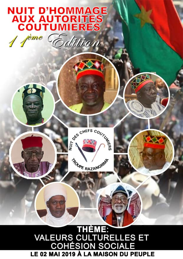 CULTURE 11 éditions de la Nuit d’hommage aux autorités coutumières Par BS. Sidwaya - 30 avril 2019 FacebookTwitterPinterestWhatsAppLinkedinE-mailImprimerTumblrTelegramViberNaver La 11e édition de la nuit d’hommage aux autorités coutumières se tient le 2 mai 2019 à la Maison du peuple de Ouagadougou sous le thème : «valeurs culturelles et cohésion sociales »