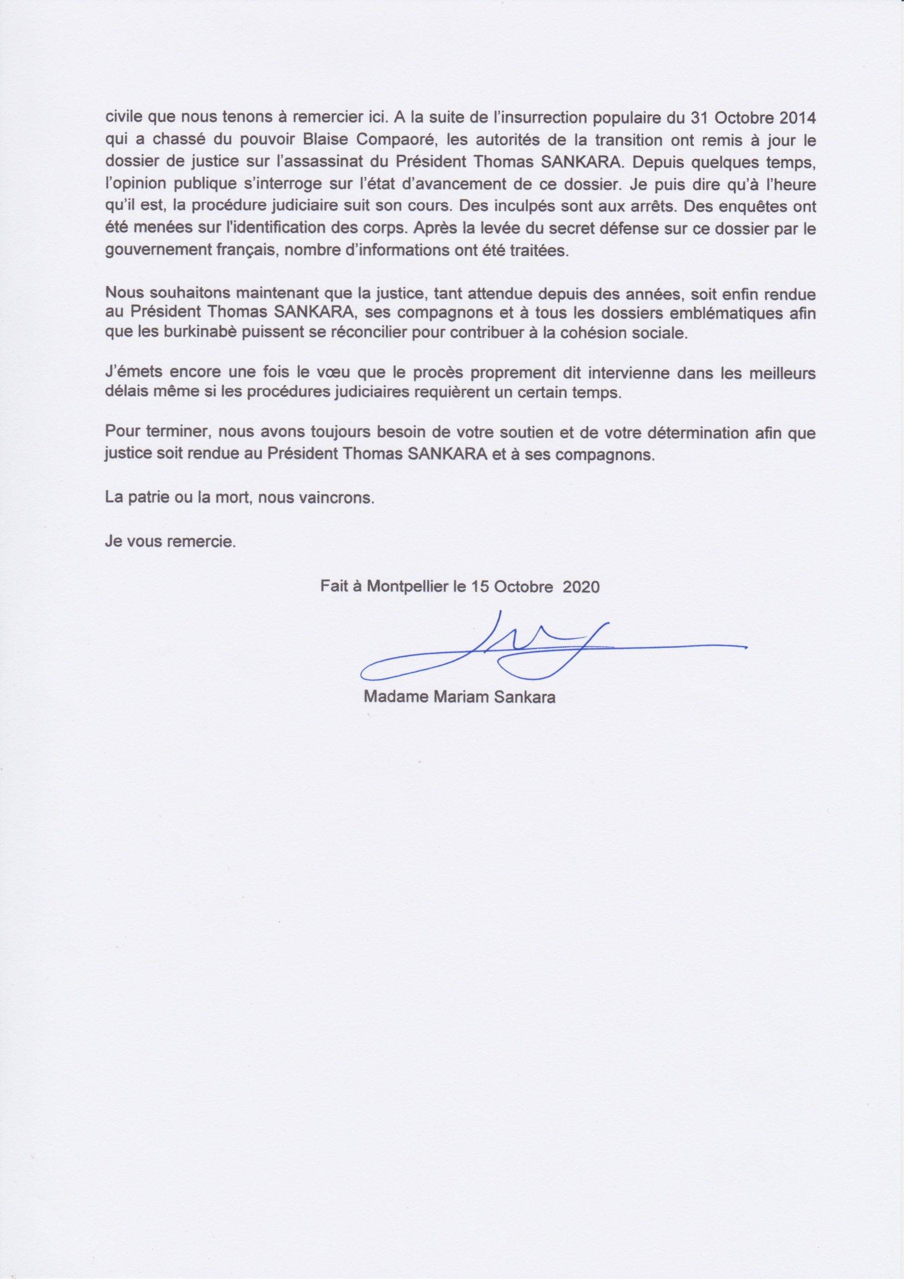Accueil 33e anniversaire de l’assassinat du Président du Faso: le message de Mariam Sankara MESSAGE DU 15 OCTOBRE 2020 1 (1)
