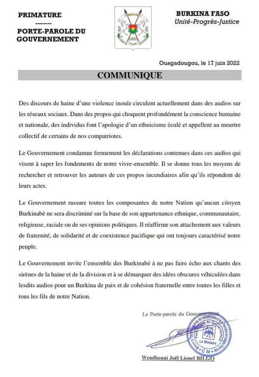 Dans un communiqué signé à la date du 17 juin 2022 à Ouagadougou, le gouvernement dénonce les discours de haine « d’une violence inouie » qui circulent dans des audios sur les réseaux sociaux. Il condamne fermement les déclarations contenues dans ces audios « qui visent à saper les fondements du vivre ensemble ».