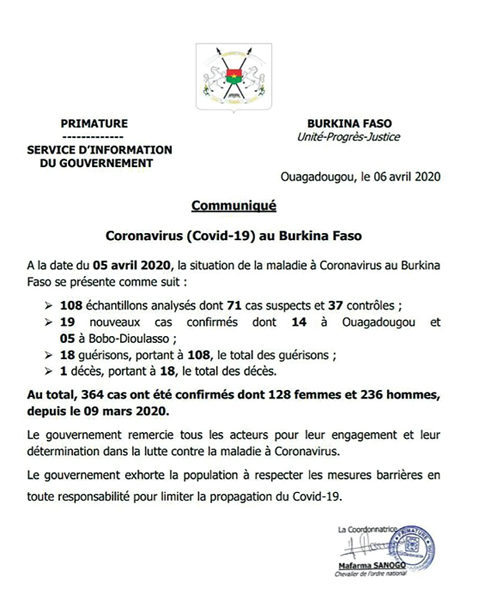 LA UNE SITESOCIETE Covid 19 au Burkina: 19 nouveaux cas , un décès a la date du 5 avril Par DD. Sidwaya - 7 avril 2020 FacebookTwitterPinterestWhatsAppLinkedinE-mailImprimerTumblrTelegramViberNaver 19 nouveaux cas , 18 nouvelle guérisons, un décès a la date du 5 avril Lire le communiqué du SIG