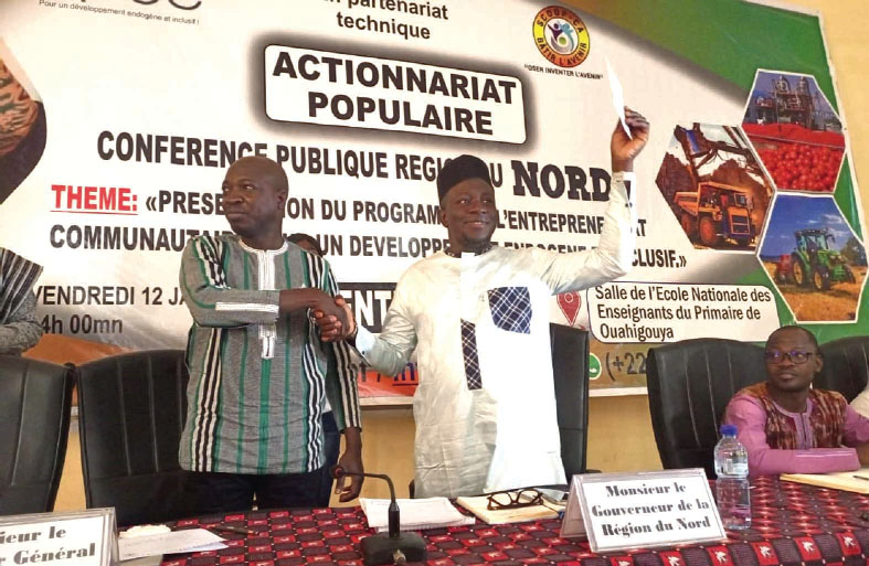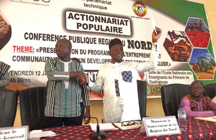 C’est sur le thème : « Actionnariat populaire pour un développement endogène et inclusif » que le gouverneur de la région du Nord, Issouf Ouédraogo a lancé, le 12 janvier 2024 dans la région du Nord, les activités de souscription de l’actionnariat communautaire. Selon lui, c’est une initiative qui va permettre à la population de la région de s’informer et de mieux comprendre les programmes de l’entrepreneuriat communautaire. « La mission de l’APEC s’inscrit dans le cadre de la vision du développement endogène et inclusif si cher au Président de la Transition, le capitaine Ibrahim Traoré qui veut donner l’opportunité aux Burkinabè de financer les projets majeurs exclusivement par les ressources endogènes. Ce développement ne sera une réalité qu’avec l’implication et la mobilisation de tous les Burkinabè », a laissé entendre le gouverneur. Durant plus de deux heures, les premiers responsables de l’APEC, en collaboration avec la société coopérative « Bâtir l’Avenir », ont échangé sur les différentes missions de cette initiative.