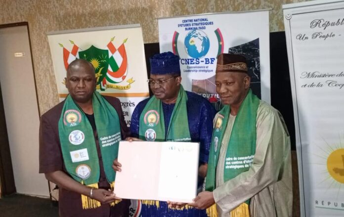 La cérémonie de passation de charges entre le directeur général du Centre d’études stratégiques du Mali, le général de Brigade Satigui SIDIBE, et le directeur général du Centre national d’études stratégiques du Burkina Faso, le général de Brigade Aimé Barthélémy SIMPORE est intervenue, ce mercredi 26 février 2025 à Ouagadougou.