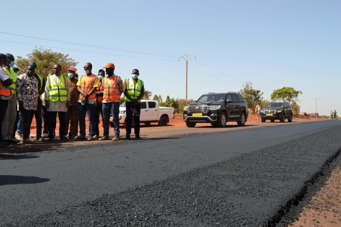 S’agissant de la route de Leguema, longue de sept kilomètres, le taux de réalisation est de 61,18%. Le goudron a déjà été coulé sur trois kilomètres jusqu’au nouveau stade en construction. Les travaux restants concernent entre autres la pose de pavés ou l’exécution de fossé triangulaire en terre. Le directeur de l‘entreprise en charge des travaux, Yacouba Ouédraogo, a rassuré le ministre et ses collaborateurs que le chantier va être livré dans le délai imparti.