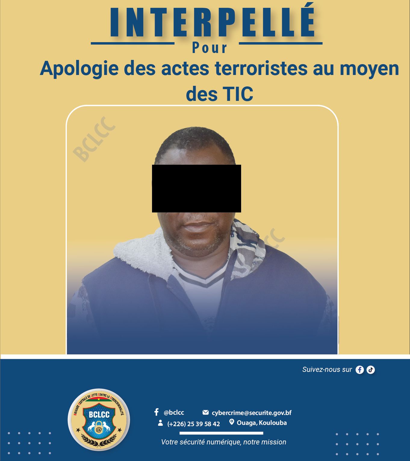 A l’issue, il a été déféré devant monsieur le Procureur du Faso près le Tribunal de grande instance Ouaga II pour répondre de ses actes. La BCLCC rappelle que l’apologie du terrorisme constitue une infraction prévue et punie par l’article 361-19 du Code pénal burkinabè. Ce type de comportement représente une menace grave pour la sécurité nationale, la paix sociale et la cohésion de notre société. La BCLCC exhorte l’ensemble des internautes à la vigilance et au sens de responsabilité.