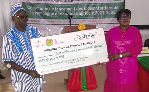 Talata Tindano, producteur de riz et de maïs dans la région de l’Est, n’a pu récolter aucun grain de ses deux spéculations au cours de la saison écoulée. Lui qui s’apprêtait à vendre son bœuf pour acheter du sorgho afin de nourrir sa famille est à présent soulagé. Il n’a pas caché sa joie en cette matinée du samedi 21 mai 2022, à Koudougou, lors du lancement des indemnisations de la campagne d’assurance agricole 2021-2022. M. Tindano a reçu le chèque de 312 mille 842 F CFA des bénéficiaires de sa région. Comme lui, ils sont au total, 194 producteurs qui ont été déclarés sinistrés par l’assurance, pour une superficie totale de 370 hectares de maïs. Ils ont été indemnisés pour un montant de 11 millions 532 mille 581 F CFA. Les bénéficiaires du Centre-Ouest ont reçu un chèque de 3 millions 577 mille 010 F CFA et ceux de la Boucle du Mouhoun, 7 millions 642 mille 723 F CFA .
