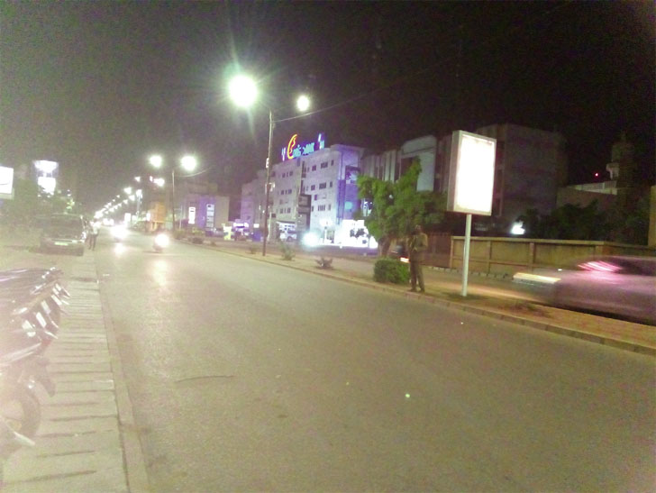 Le temps est beau en ce début de soirée du samedi 27 juillet 2019. La pluie a arrosé la capitale burkinabè. Il est environ 20h30. Nous abordons l’avenue Kwame-N’Krumah par le rond-point des Nations unies. Les lampadaires éclairent la voie urbaine de lumières blanches. Une fille en tenue légère, à moto, est devant nous. Le trafic est dense dans le sens opposé. Voitures, motos, vélos quittant la grande avenue. La quatrième vitesse activée, nous sommes obligés de ralentir à la vue d’une barrière de police à la hauteur du commissariat central de Ouagadougou. Virage à gauche pour tous les usagers.