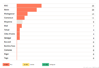Cinq pays, à savoir le Burundi, le Burkina Faso, les Comores, le Niger et le Togo sont bons derniers avec zéro point dans leurs besaces, contre un score moyen régional de 8/100 points.