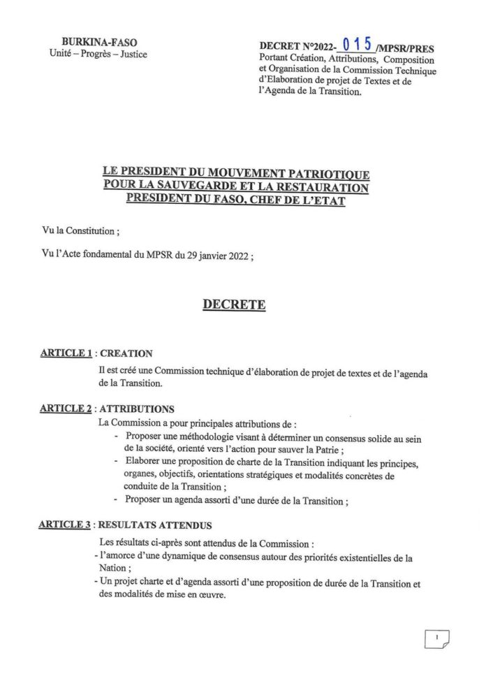 Le Président du Mouvement Patriotique pour la Sauvegarde et la Restauration, Président du Faso, chef de l’Etat, Paul Henri Sandaogo Damiba, a créé par décret une Commission technique d’élaboration de projet de textes et de l’agenda de la Transition. La commission est composée des personnalités suivantes: