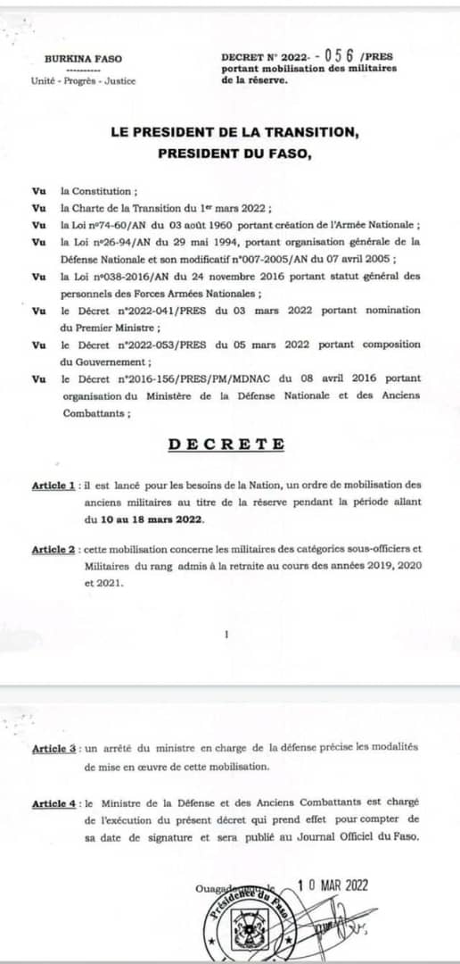 Dans un décret signé le 10 mars 2022, le Président de la Transition, Président du Faso, Paul Henri Damiba lance pour les besoins de la Nation, un ordre de mobilisation des anciens militaires au titre de la réserve pendant la période allant du 10 au 18 mars 2022.