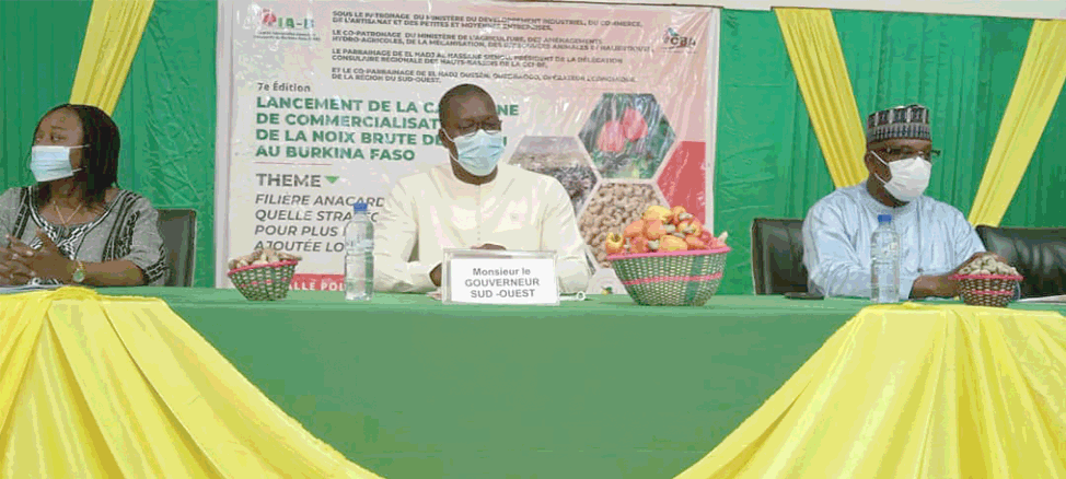 Nous les invitons à ne pas brader et surtout dénoncer ceux qui voudraient le faire », a lancé Ibrahim Sanfo. Le gouverneur de la région du Sud-Ouest, Emmanuel Zongo, s’est félicité de la tenue de la cérémonie de lancement de la campagne dans sa région, 2e du pays en matière de production. Pour lui, la filière de l’anacarde est très porteuse et a besoin d’encadrement. « Pour cette saison, je pense que le ministère en charge du commerce va veiller, avec les acteurs, à l’effectivité de ce prix pour qu’on ne brade pas la production.