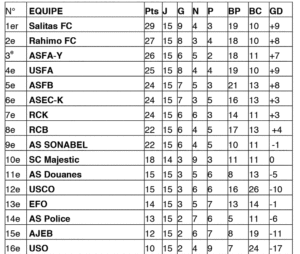 Le championnat national de football de première division a désigné son champion de la mi- saison. Salitas FC termine la phase aller en tête du classement, grâce à sa victoire (2-0) face à l’AS SONABEL en clôture de la 15e et dernière journée, dimanche 30 décembre.