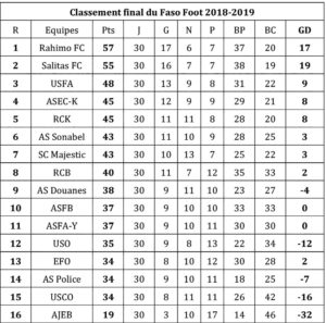 Avec ce titre, Rahimo FC est récompensé pour sa constance tout au long de la saison. En plus, l’équipe bobolaise peut réaliser le doublé puisqu’elle disputera la finale de la Coupe du Faso le 26 mai 2019 face à l’AS-SONABEL. Si la lutte pour le titre a été palpitante jusqu’au bout, elle l’a été également en bas de tableau pour le maintien. Cette dernière journée devrait désigner l’équipe qui accompagnera l’AJEB, déjà reléguée, en deuxième division. Quatre mal-classées jouaient leur survie en première division : L’Union sportive de la Comoé (USCO), l’Union sportive de Ouagadougou (USO), l’Etoile filante de Ouagadougou (EFO) et l’AS Police.