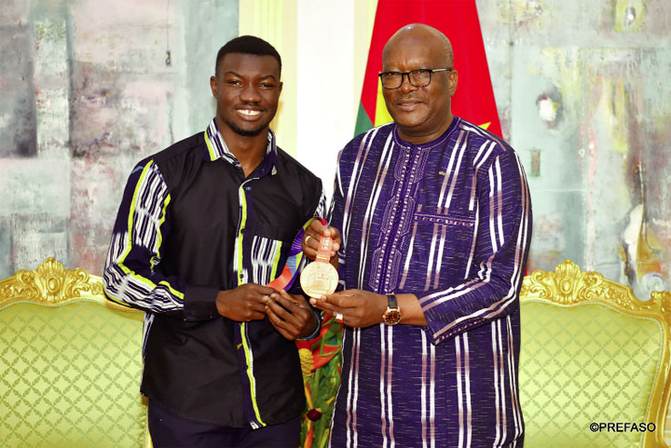Après l’exploit, la reconnaissance au plus haut sommet de l’Etat pour Hugues Fabrice Zango. Le médaillé de bronze aux derniers mondiaux d’athlétisme a en effet reçu les félicitations du Président du Faso, Roch Marc Christian Kaboré, dans la matinée du mardi 8 octobre 2019 au palais de Kosyam. Hugues Fabrice Zango, a confié, à sa sortie d’audience, être venu présenter sa médaille au chef de l’Etat et lui témoigner sa gratitude pour le soutien, notamment la bourse dont il a bénéficiée dans la préparation de la compétition. Il a dit avoir par ailleurs saisi l’occasion pour présenter au président du Faso, son projet pour les Jeux olympiques de l’année prochaine. «Au nom du peuple burkinabè, son Excellence a dit toute la fierté qu’il ressentait. Il nous a aussi rassuré en prenant des engagements en vue de nous soutenir pour 2020», a-t-il affirmé. Des propos corroborés par le ministre des Sports et des Loisirs qui avait accompagné l’athlète. Daouda Azoupiou a, dans ce sens, indiqué qu’ils sont cinq athlètes de haut niveau à bénéficier d’une bourse mensuelle en guise de soutien depuis le mois de janvier. «Et le président du Faso a instruit le ministère de voir dans quelle mesure renforcer cet appui à leur endroit pour leur permettre de mieux se préparer pour les échéances futures», a précisé le ministre Azoupiou. En rappel, Hugues Fabrice Zango, 26 ans, s’est adjugé le bronze au concours du triple saut, le 29 septembre 2019 à Doha, grâce à un saut à 17,66m. Il devient ainsi le premier Burkinabè médaillé aux championnats du monde d’athlétisme et le deuxième Africain après la 3e place du Nigérian Ajayi Agbebaku en 1983.