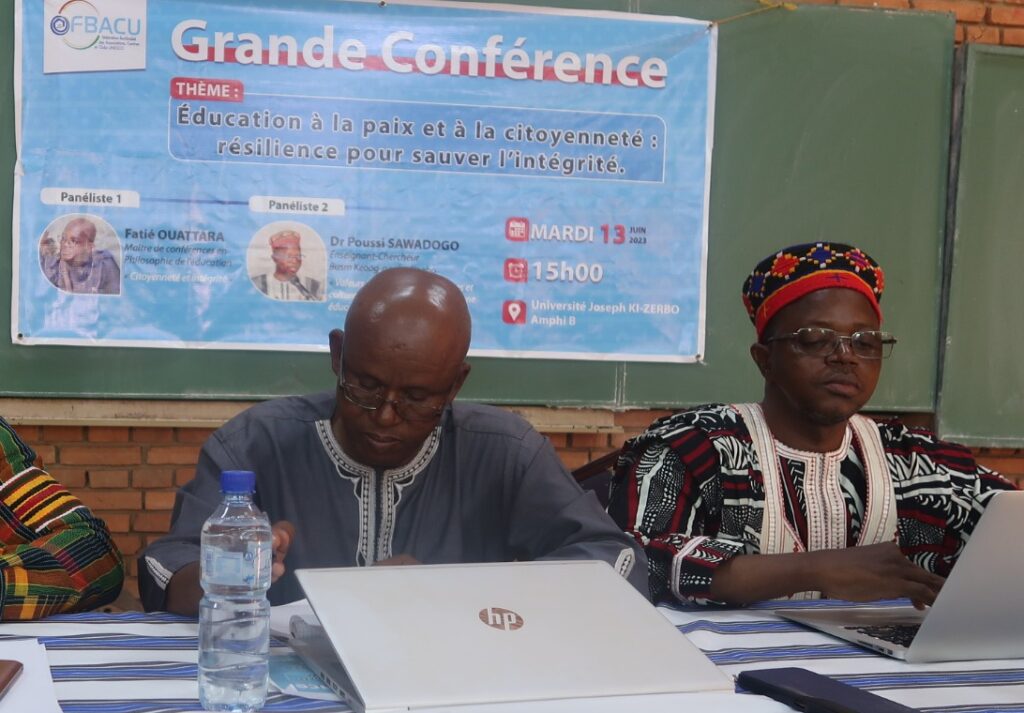 La Fédération burkinabè des associations, centres et clubs UNESCO (FBACU) a organisé une conférence publique le mardi 13 juin 2023 à l’Université Joseph-Ki-Zerbo sur le thème : « Education à la paix et à la citoyenneté : résilience pour sauver l’intégrité ». La conférence a été animée par les enseignants-chercheurs, Dr Poussi Sawadogo et Dr Fatié Ouattara à l’intention d’un public estudiantin.