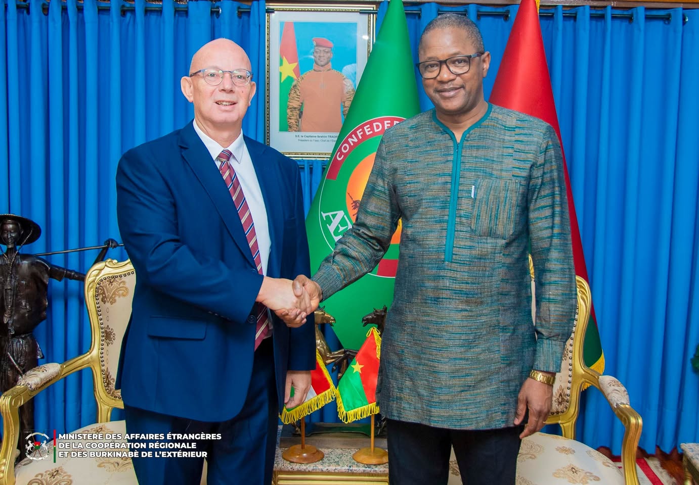Le ministre des Affaires étrangères, de la Coopération régionale et des Burkinabè de l’extérieur, SEM Karamoko Jean Marie Traoré a reçu en audience, ce lundi 8 septembre 2025, l’ambassadeur de la Hongrie auprès du Burkina Faso, Son Excellence monsieur Tamás Endre Fehera.