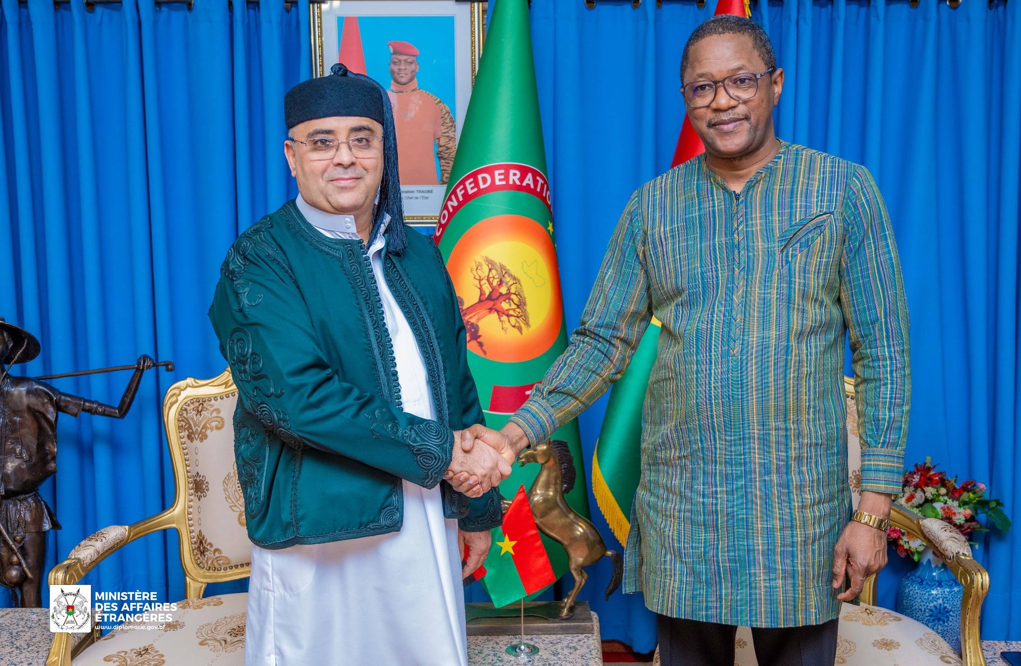 Le ministre des Affaires étrangères, Son Excellence Monsieur Karamoko Jean Marie TRAORÉ, accompagné du ministre délégué, Madame Bêbgnansgna Stella Eldine KABRÉ/KABORÉ, a reçu en audience, le jeudi 15 janvier, le Chargé d’Affaires de l’ambassade de la Libye au Burkina Faso.