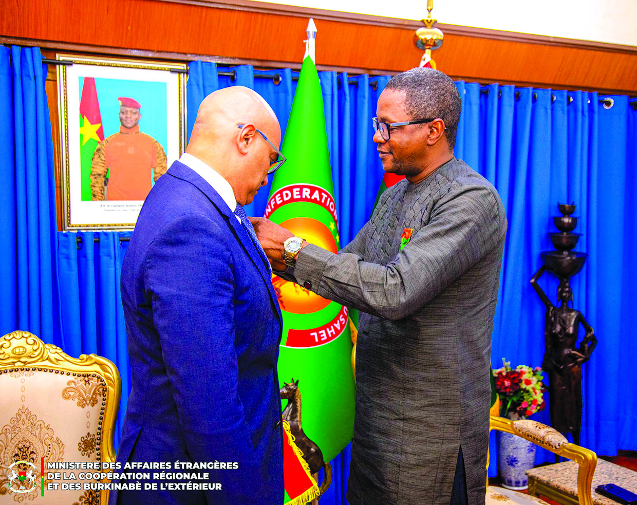 En fin de mission au Burkina Faso, l’ambassadeur de la République Arabe d’Egypte a été fait Officier de l’Ordre de l’Etalon à titre exceptionnel, ce 25 août 2025, par le ministre des Affaires étrangères, de la Coopération régionale et des Burkinabè de l’extérieur, Son Excellence Karamoko Jean Marie Traoré.