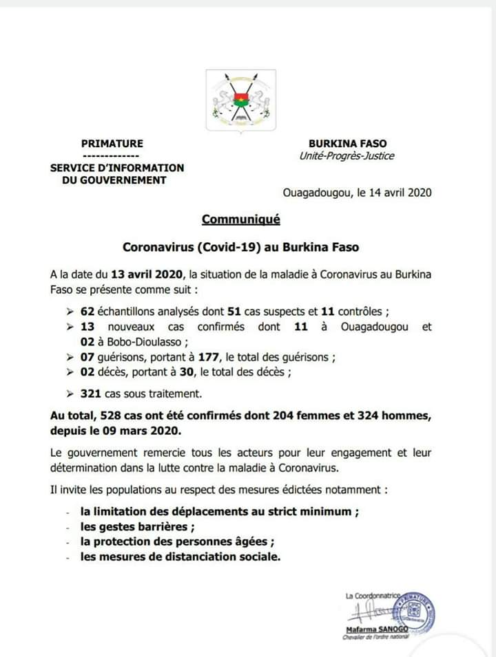 A la date du 13 avril 2020, la situation de la maladie à Coronavirus au Burkina Faso se présente comme suit :