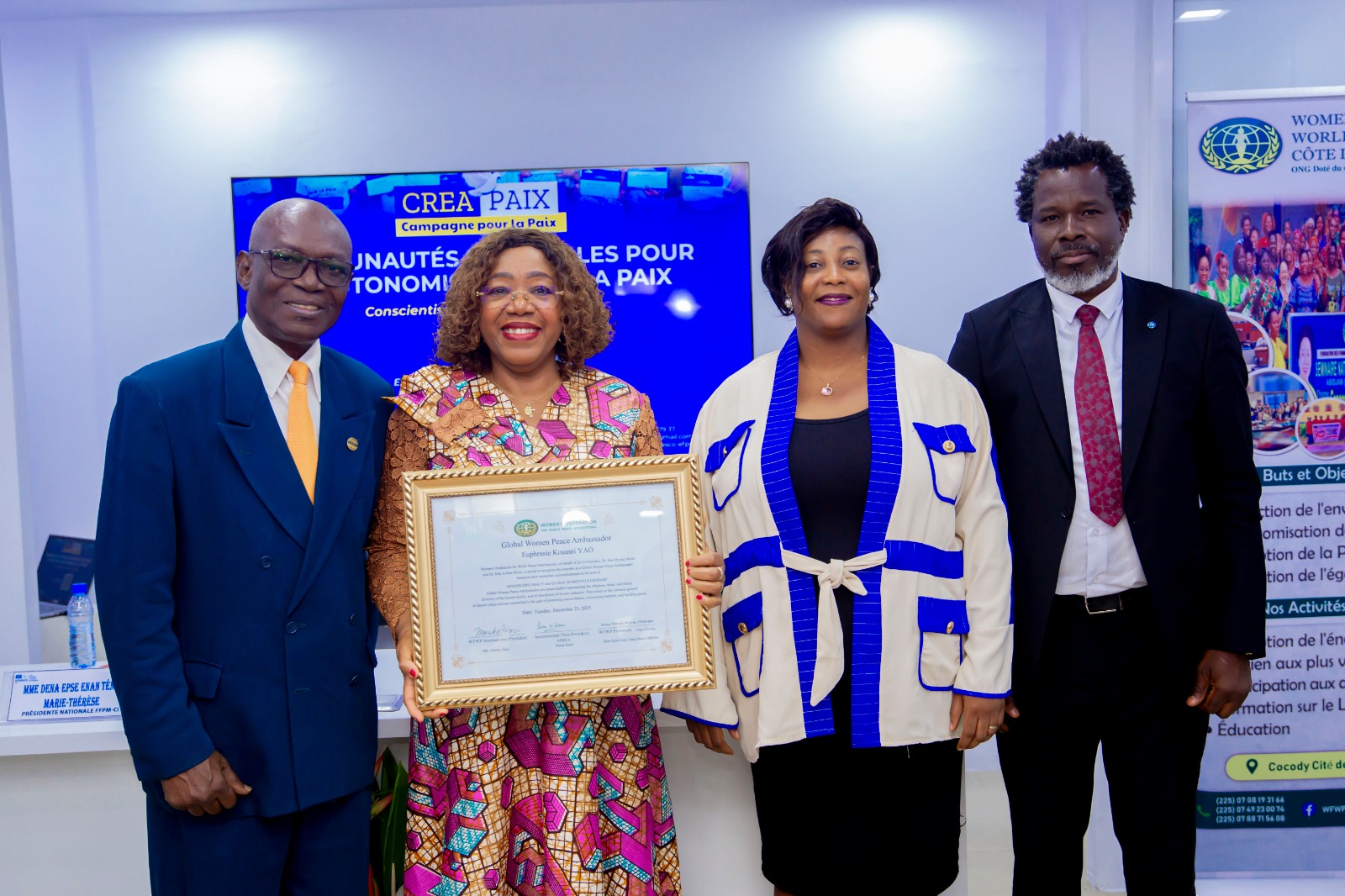 La Fédération des Femmes pour la Paix Mondiale (FFPM) a décerné, le lundi 23 décembre 2025, la prestigieuse distinction Global Women Ambassador for Peace à Madame Euphrasie Kouassi Yao, ministre, Conseillère spéciale du Premier ministre ivoirien et titulaire de la Chaire UNESCO « Eau, Femmes et Pouvoir de Décision » (CUEFPOD).