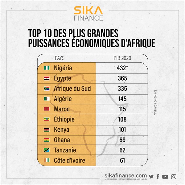 D’après le site d’information financière et économique relatif à la Bourse dans les 8 Pays de l’UEMOA, Sika finance (sikafinance.com), la Côte d’ivoire réintègre le top 10 des plus grandes puissances économiques de l’Afrique en 2020. Selon les récentes données de la Banque mondiale, le pays d’Alassane Ouattara occupe le 10e rang avec un PIB de 61,35 milliards de dollars, soit 36124,7 milliards FCFA, devenant ainsi le seul pays francophone subsaharien à figurer dans ce classement.