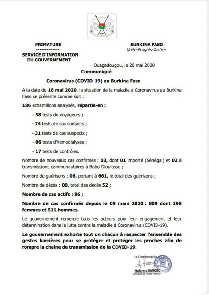 Nombre de nouveaux cas confirmés : 03, dont 01 importé (Sénégal) et 02 à transmissions communautaires à Bobo-Dioulasso ;