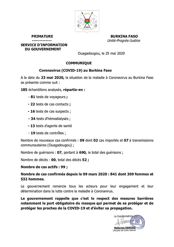 A la date du 23 mai 2020, la situation de la maladie à Coronavirus au Burkina Faso se présente comme suit :
