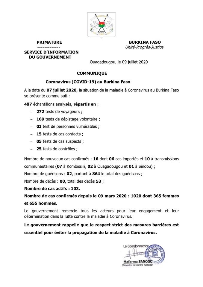 A la date du 07 juillet 2020, la situation de la maladie à Coronavirus au Burkina Faso se présente comme suit :