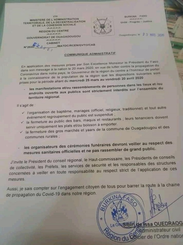 COMMUNIQUELA UNE SITESOCIETE COVID19: fermeture des gros marchés et yaar de la région du centre Par BS. Sidwaya - 23 mars 2020 FacebookTwitterPinterestWhatsAppLinkedinE-mailImprimerTumblrTelegramViberNaver Lire communiqué ci-dessous