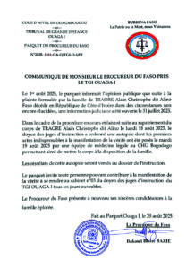 Dans ce communiqué, en date d’hier mercredi 20 août, le procureur du Faso près le Tribunal de grande instance (TGI) Ouaga I informe qu’une autopsie du corps de Alain Christophe Traoré dit Alino Faso a été faite, dans le cadre d’une information judiciaire ouverte à la suite de son décès en détention en Côte d’Ivoire.