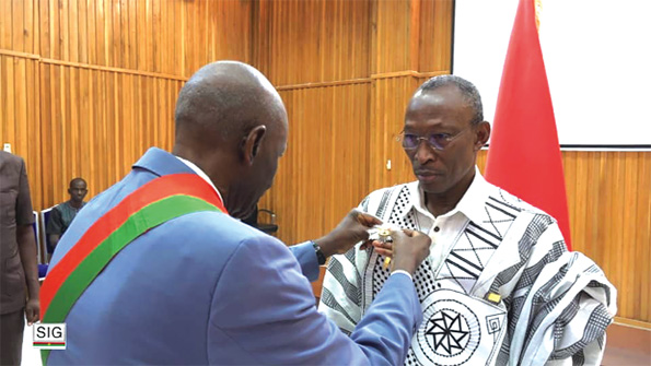 La cérémonie solennelle de décoration a eu lieu, le mardi 27 juin 2023, à la Grande chancellerie à Ouagadougou. Le chef du gouvernement a reçu sa distinction honorifique des mains du Grand Chancelier des Ordres burkinabè, André Roch COMPAORE. Il s’agit d’une distinction à titre exceptionnel conformément à un décret présidentiel de 2018 qui stipule que le Premier ministre, 6 mois après son entrée en fonction, est élevé à la dignité de Grand Officier de l’Ordre de l’Etalon.