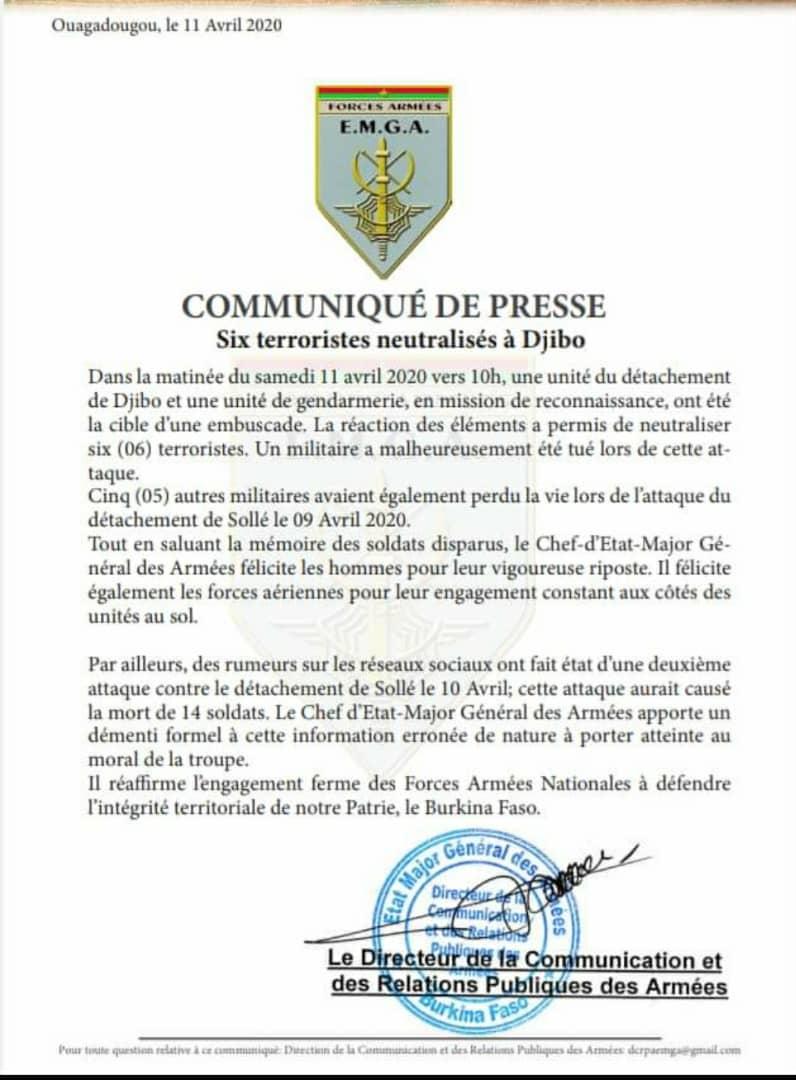 LA UNE SITEPOLITIQUE Djibo: Six terroriste tués par les FDS Par BS. Sidwaya - 12 avril 2020 FacebookTwitterPinterestWhatsAppLinkedinE-mailImprimerTumblrTelegramViberNaver Djibo: Six terroriste tués par les FDS le samedi 11 avril 2020