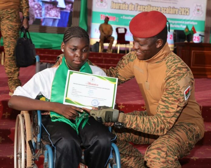 Placée sous le thème « excellence scolaire, un tremplin pour l’engagement patriotique et le développement endogène au Burkina Faso », l’édition 2025 de l’excellence scolaire et professionnelle a eu lieu ce vendredi 22 Août 2025 à Ouagadougou. Présidé par le Président du Faso, Ibrahim Traoré, le mérite des meilleurs élèves du certificat d’études primaire (CEP), du certificat d’aptitude professionnelle (CAP), du brevet d’études du premier cycle (BEPC), du brevet d’études professionnelle (BEP), du baccalauréat toutes séries confondues et des meilleurs élèves vivant avec un handicap a été reconnu. Ils ont reçu des kits scolaires et des bourses d’études. Et les 26 meilleurs enseignants des différentes régions issus de l’enseignement primaire et du post -primaire et secondaire ont reçu des lettres de félicitation de la part du président du Faso. Parmi eux, c’est l’enseignante Mawa Baoula/Kanyoulou de l’école Kua Nord du Houet qui est la sacrée super enseignante du primaire. Pour le super enseignant du post-primaire et secondaire, c’est l’enseignant Adama Zallé du lycée scientifique de Bobo -Dioulasso qui remporte le trophée. Ils repartent chacun avec un trophée, un chèque de 5 000 000FCFA et une villa. Ils ont également été élevés respectivement au rang d’officier et de chevalier de l’ordre des palmes académiques.