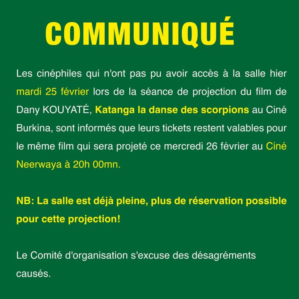 ACTUALITESCULTUREFLASHLA UNE SITESOCIETE FESPACO 2025 : les cinéphiles qui n’ont pas accède la salle pour le film katanga peuvent le suivre ce soir avec les même tickets Par Wamini SIDWAYA - 26 février 2025 FacebookTwitterPinterestWhatsAppLinkedinE-mailImprimerTumblrTelegramViberNaver FESPACO 2025 : les cinéphiles qui n’ont pas eu accès à la salle hier pour le film Katanga la danse de scorpions peuvent suivre le film ce mercredi au ciné Neerwaya à 20h avec le même ticket. #Sidwaya.info