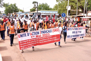Les travailleurs du public et du privé ont célébré la Fête du Travail, le lundi 1er mai 2023 à Ouagadougou. Regroupés le long de la rue bordant le côté nord de la cathédrale de la capitale burkinabè, ils ont marché jusqu’au cabinet du ministère en charge de la fonction publique sur la rue Mogho Naaba Kom I où une plate-forme revendicative a été remise au Premier ministre, Apollinaire Joachimson Kyélem de Tambela.