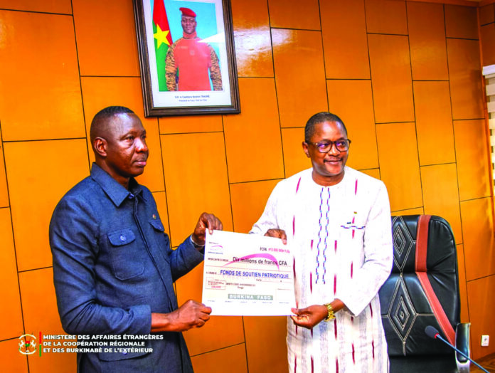 Le ministre des Affaires Etrangères, de la Coopération régionale et des Burkinabè de l’extérieur, Karamoko Jean Marie Traoré, a présidé la cérémonie de remise de don au Fonds de soutien patriotique de la diaspora burkinabè au Ghana et au Niger, le mercredi 8 octobre 2025 à Ouagadougou.