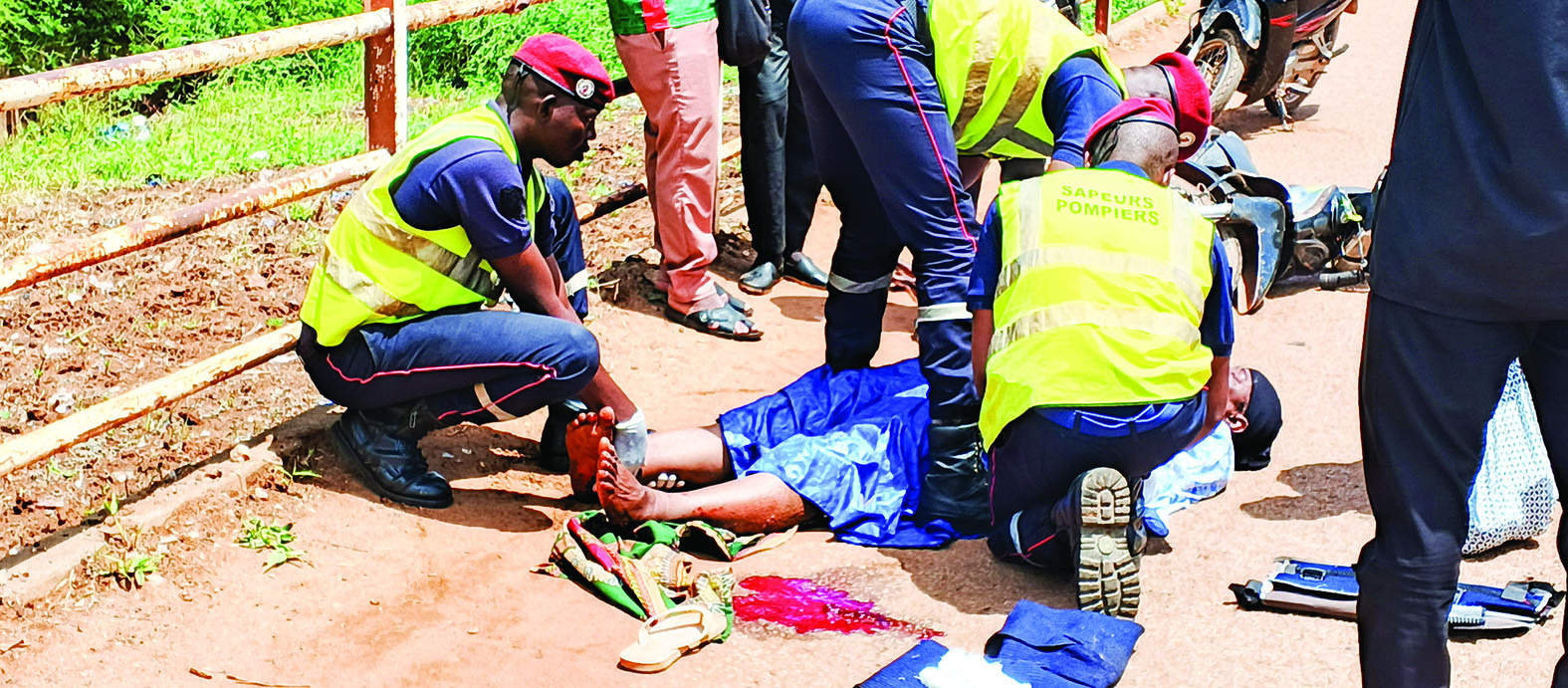 Au regard de ces faits choquants, les passants s’organisent en plaçant des pneus usés sur le sens de la voie où sont couchées les victimes. Une foule compacte se forme. Les témoins par curiosité continuent d’affluer. En se pressant autour des victimes, ils bloquent l’air, voire étouffent les accidentés déjà en détresse. Plus grave encore, des personnes sans formation en secourisme essaient de redresser la tête du jeune Ismaël, ignorant qu’un tel geste peut aggraver une lésion cervicale. Le hic, l’attroupement empêche le caporal Boureima Ouédraogo et ses hommes de la 17e compagnie d’incendie et de secours, arrivés sur les lieux, d’intervenir efficacement. Ils mènent un double combat : sauver les blessés et repousser la foule de badauds curieux. Visiblement agacé par l’agitation autour des victimes, le caporal Ouédraogo demande de leur faire de l’espace afin de pouvoir travailler sereinement.