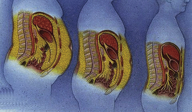 et l’apport alimentaire souvent excessif qui l’empêchent de se transformer en énergie. La présence excessive de graisse au niveau de l’abdomen peut engendrer : une élévation de la tension artérielle, un excès de sucre dans le sang. A la longue, des maladies peuvent survenir.