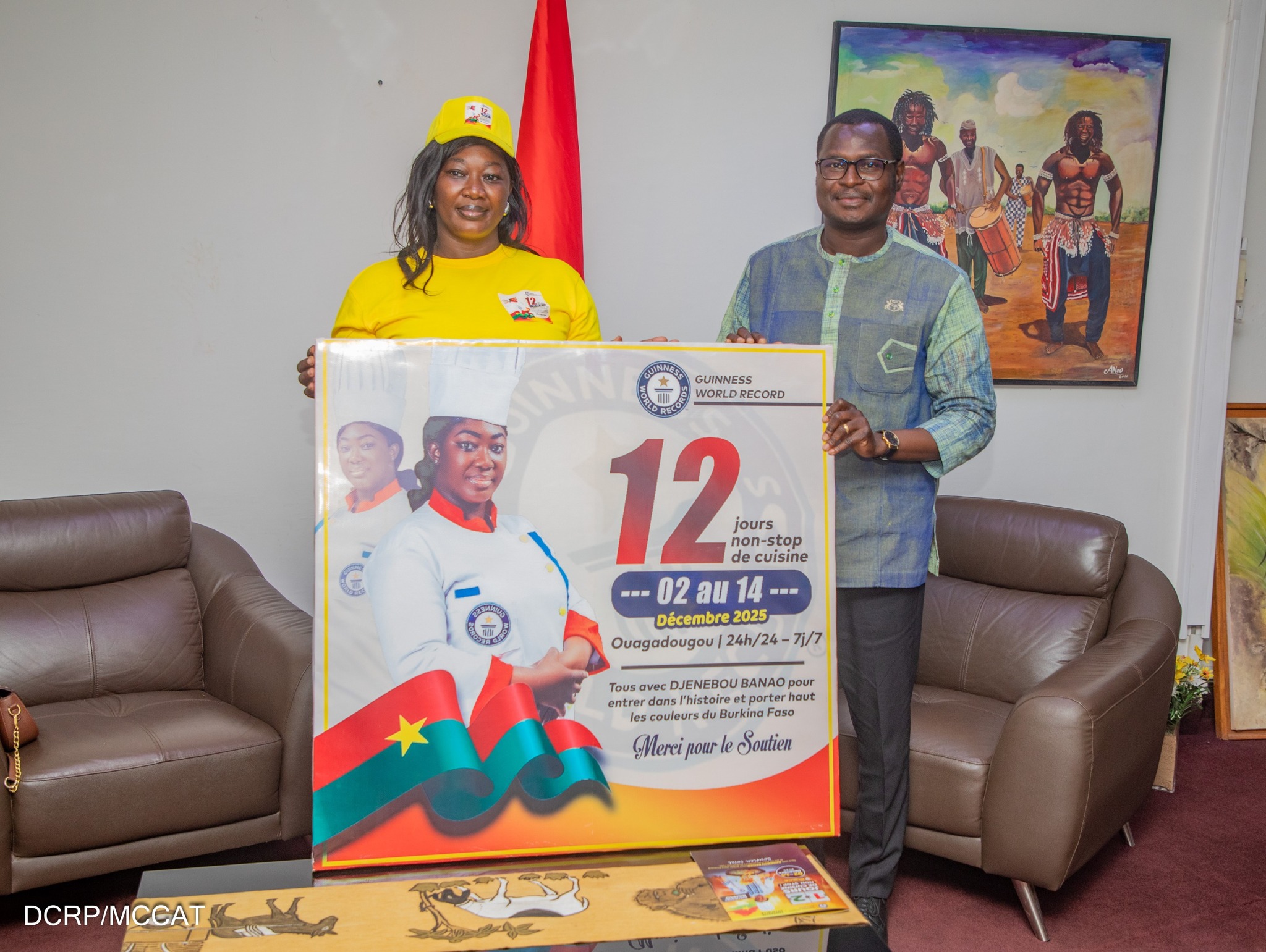 Le ministre de la Communication, de la Culture, des Arts et du Tourisme, Pingdwendé Gilbert Ouédraogo, a recu en audience ce mardi 21 octobre 2025, la candidate burkinabè au record Guiness du plus long marathon culinaire.