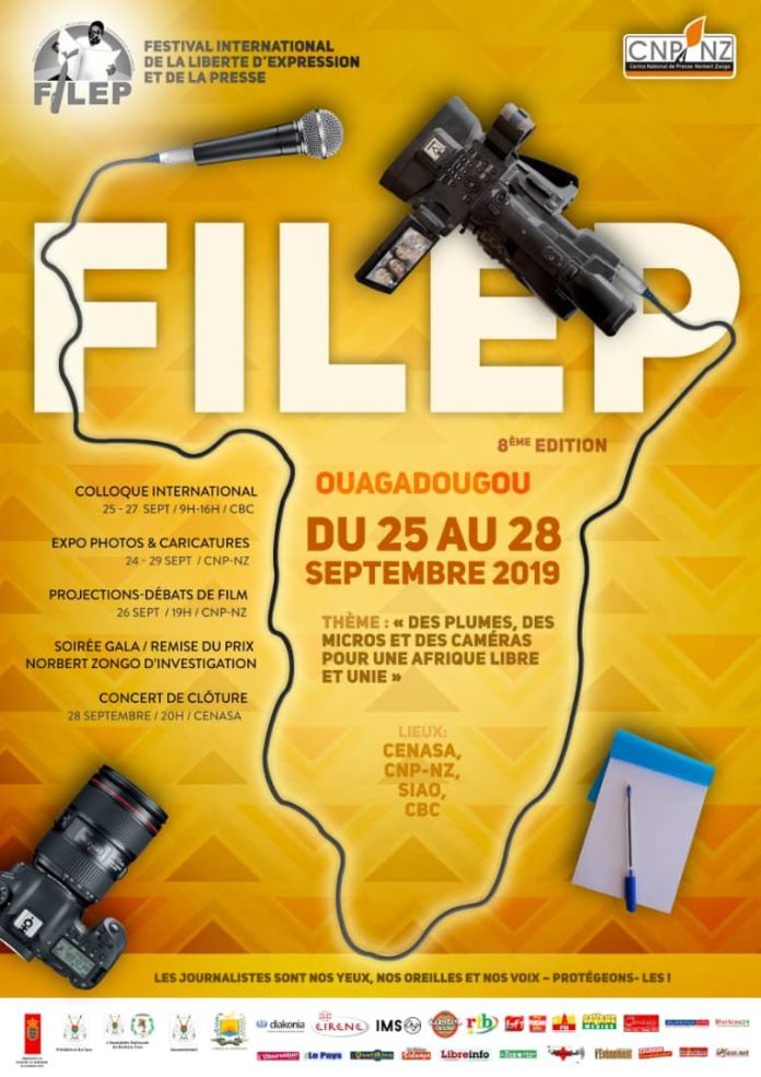 Le Centre National de Presse Norbert Zongo a le plaisir d’informer le monde des médias et les défenseurs des droits humains de l’Afrique que la huitième édition du Festival International de la Liberté d’Expression et de Presse (FILEP) se tiendra du 25 au 28 septembre 2019 à Ouagadougou. Ce rendez-vous biennal aura pour thème cette année : « Des plumes, des micros et des caméras pour une Afrique libre et unie »