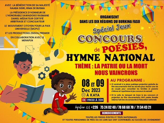 Le président du Mouvement citoyen pour la paix universelle(MCPU) Germain Zinsou veut être « utile à la nation burkinabè». Pour cela, son association lance le vendredi 8 décembre 2023 à Kaya la deuxième édition du ‘’Jeu concours de poésie et de l’hymne national, au profit des écoliers du Burkina‘’.