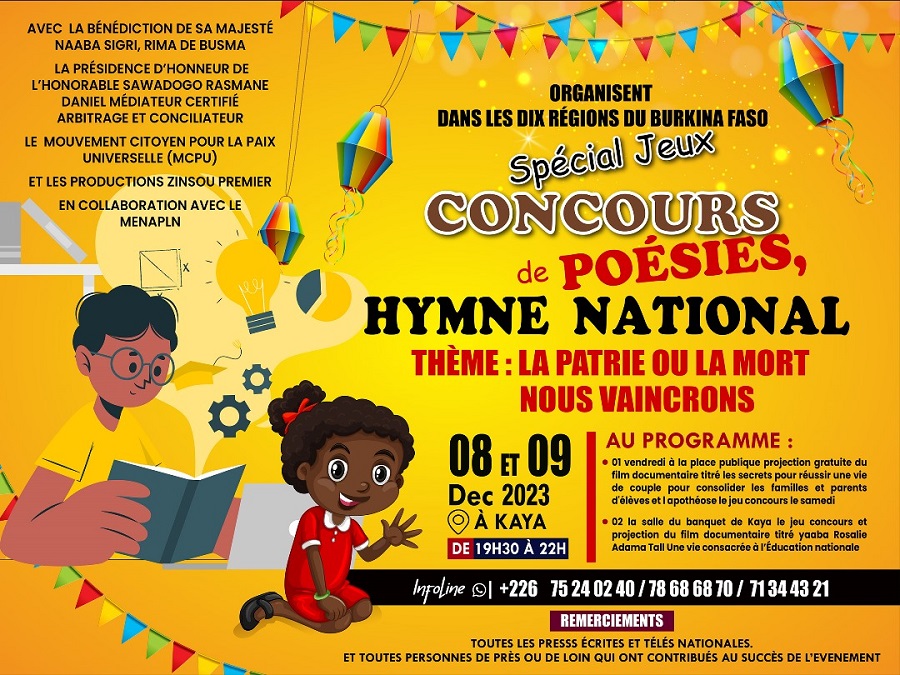 Le Mouvement citoyen pour la paix universelle(MCPU) organise la deuxième édition de son Jeu concours de poésie et de l’hymne national au profit des écoliers du Burkina Faso.