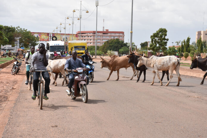 Cette image illustre parfaitement cette situation sur le Boulevard de l’insurrection populaire des 30 et 31 octobre 2014, dans la zone de Ouaga 2000, où des usagers discutent la voie aux animaux, le tout dans un incivisme patent. En effet, en plus de la divagation des animaux, aucun des usagers des engins à deux roues n’a porté de casque, le cycliste se rend coupable de l’usage d’un téléphone en circulation et un autre motocycliste a garé son engin sur le trottoir.