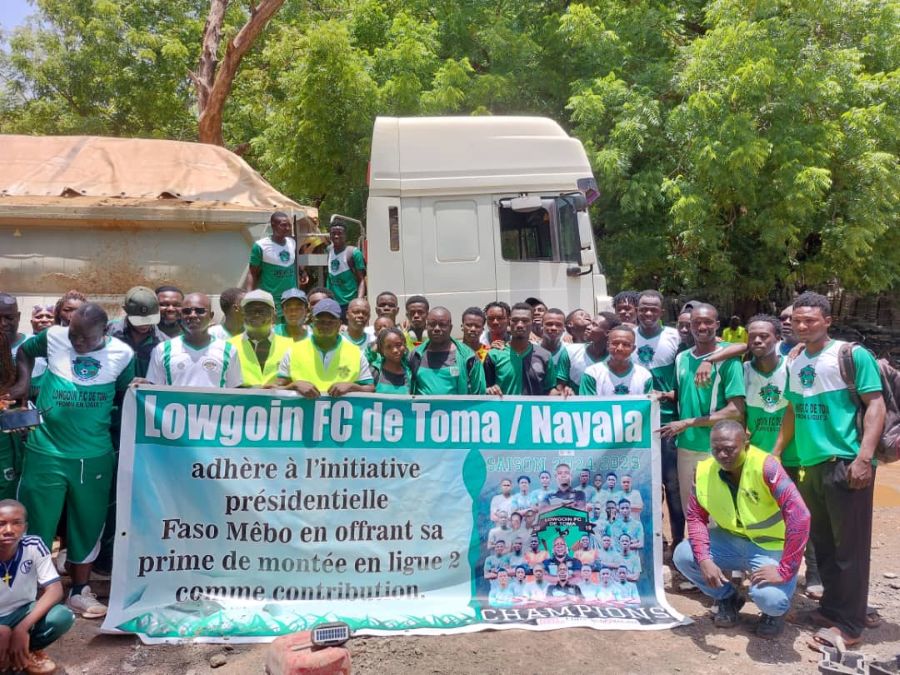 Récemment promu en deuxième division, le Lowgoin FC de Toma a fait un geste de solidarité en offrant l’équivalent de sa prime de montée à l’initiative Faso Mebo. La somme, convertie en agrégats, a été officiellement remise ce samedi matin.
