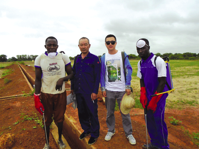 A l’autre bout du champ, un autre expert chinois, Li Zhengyang, explique à deux employés les techniques de traitement de la culture du mil hybride. Bidons au dos et des tuyaux en main, ils sillonnent le champ pour pulvériser les mauvaises herbes. Adama Ouédraogo est l’un des employés dans le champ des Chinois.