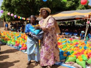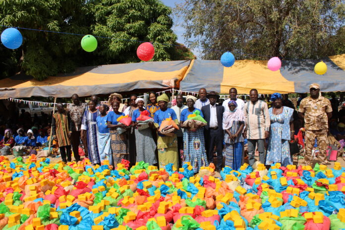 Le don est constitué, entre autres, de 7 tonnes de riz, 50 cartons de 24 boules de savon, 350 couvertures pour les femmes des FDS et des VDP et 14 vélos pour les meilleurs élèves de l’Association Pia et les enfants du centre Oasis J.B. Selon la promotrice et directrice du centre Oasis J.B, Clarisse Missoni, cette année, il s’agissait de rendre hommage aux FDS et aux VDP tombés, dont les veuves sont parmi les bénéficiaires, d’où le thème : « Hommage aux personnes âgées, solidarité avec les personnes déplacées internes et soutien aux veuves des FDS et VDP tombés pour la Patrie ».