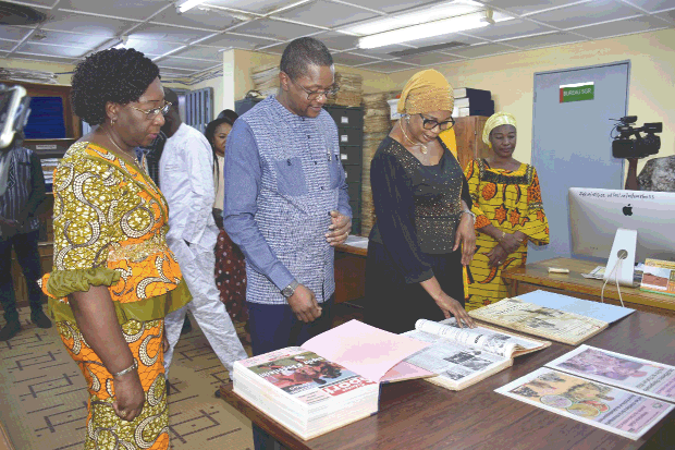 Accompagné de la ministre déléguée chargée de la Coopération régionale, Estella Kabré (gauche), Karamoko Jean Marie Traoré a visité le service des archives où il a découvert une « mine d’informations ».