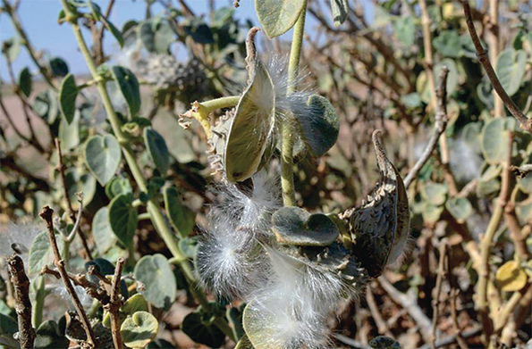 Ce buisson vivace peut atteindre 1 m de haut. Les jeunes rameaux volubiles s’enroulent autour des tiges plus anciennes, lui donnant un aspect touffu. Ils contiennent du latex blanc. Au moindre contact, les feuilles et fruits sécrètent un fluide blanc collant (Benhouhou, 2005). Des poils courts recouvrent toute la plante. Les feuilles sont opposées, simples et entières, de couleur vert- amande et en forme de cœur. Le limbe foliaire est légèrement charnu, largement ovale, à sommet obtus à aigu, à poils courts denses sur les deux faces, gris argenté (photo 1). Les inflorescences en grappes abondantes au bout de longs pédoncules, sont de couleur blanche- jaunâtre. Les fruits habituellement composés de deux follicules, portent de petites pointes. (Ozenda, 1991 ; Oyen, 2013). A maturité, les fruits s’ouvrent et laissent échapper des graines à aigrettes de poils blancs, caractéristiques de la famille des asclépiadacées. Les graines sont ovoïdes, aplaties, de 7–9 mm × environ 6 mm, bords pâles, à poils courts denses, munies d’une touffe de poils à une extrémité, d’environ 3 cm de long (photo 2). Les feuilles contiennent des cristaux d’oxalate de calcium et de l’acide oléique. Les racines contiennent elles des cardioïdes, glucosides b-sitosterol, ghalakinoside, pergularines, coroglaucigenine, choline, terpénoïdes, saponine, polyphénols (flavonoïdes) et caroténoïdes (Laouedj, 2020).La plante était largement distribuée dans la Corne de l’Afrique (Gohar et al, 2000) jusqu’au Sinaï, en Jordanie et en Arabie saoudite (Al-Farraj et Al-Wabel, 2007). Elle est présente en Afrique subsaharienne et abondante dans les steppes sahéliennes de la zone de la mare d’Oursi, au Burkina Faso. La plante est toxique à cause du latex et de la substance cardioïde des racines. Le latex des tiges et des feuilles irrite la peau et les yeux et peut provoquer une inflammation (Mossallam et BaZaid, 2000). Alors, le latex est corrosif et nocif à la peau.