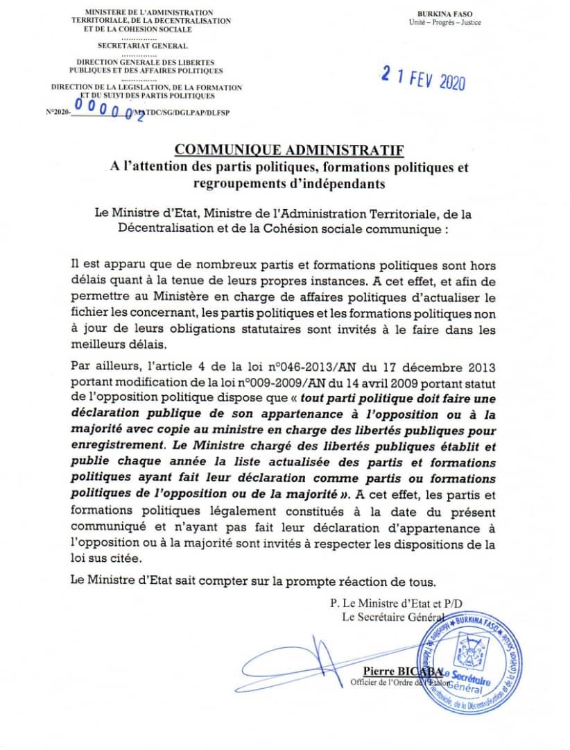 LA UNE SITEPOLITIQUE Le ministre Siméon Sawadogo invite les partis politiques à se mettre à jour Par BS. Sidwaya - 21 février 2020 FacebookTwitterPinterestWhatsAppLinkedinE-mailImprimerTumblrTelegramViberNaver Le ministre d’Etat, ministre de l’administration territoriale, de la décentralisation et de la cohésion sociale, invite les partis politiques de se mettre à jour de leurs obligations statutaires. Communiqué