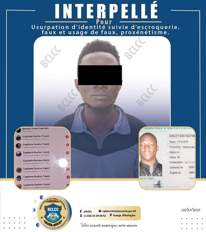 Selon la brigade le présumé escroc, est âgé de 29 ans et de nationalité étrangère, il opérait à travers une soixantaine de faux comptes Facebook dénommés « capitaine Ibrahim Traoré » « Ibrahim Traoré » « Traoré Ibrahim » ou « capitaine Ib Traoré » proposait à ses victimes une aide financière pour financer leurs projets.